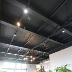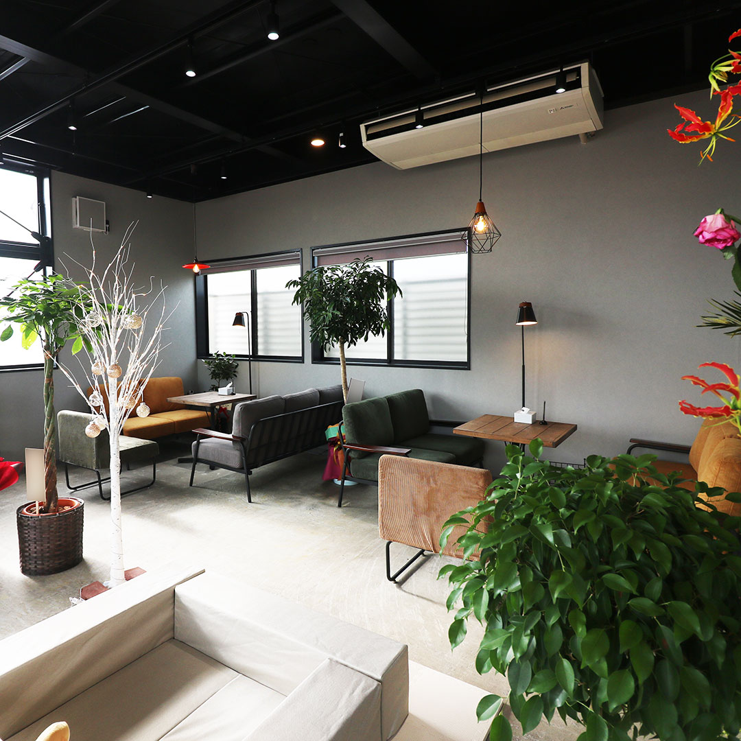 ブラックを基調としたモダンな外観と自然光が差し込み明るく開放的なリラックスできるカフェ風の空間の店内。